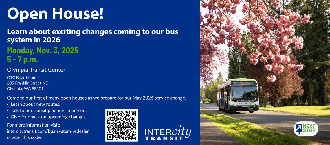 Learn about exciting changes coming to our bus system in 2026! Come to our first of many open houses as we prepare for our May 2026 service change. Learn about new routes. Talk to our transit planners in person. Give feedback on upcoming changes. When: Monday, Nov. 3 2025 from 5 - 7 p.m. Where: Olympia Transit Center Boardroom: 205 Franklin Street NE Olympia, WA 98501