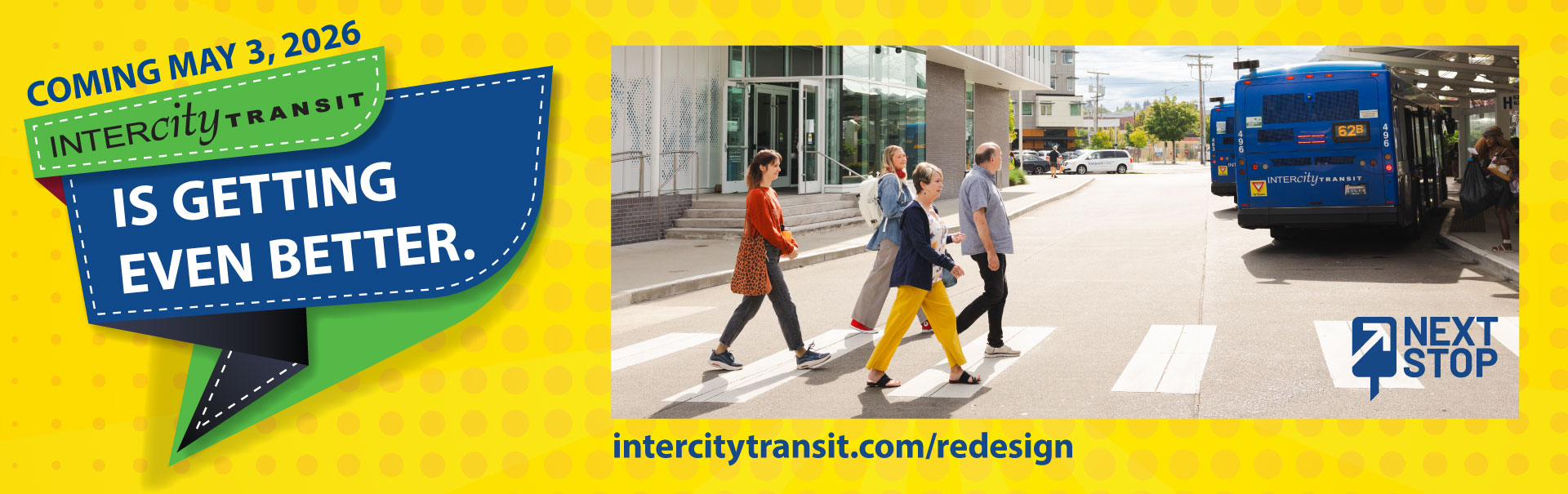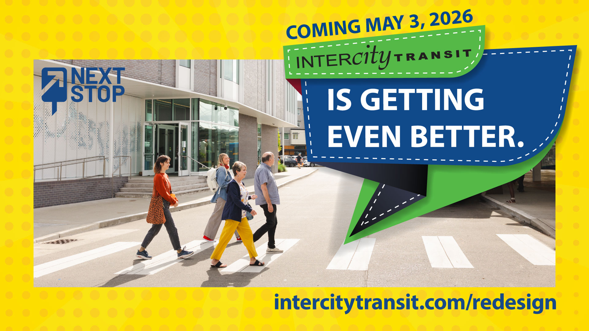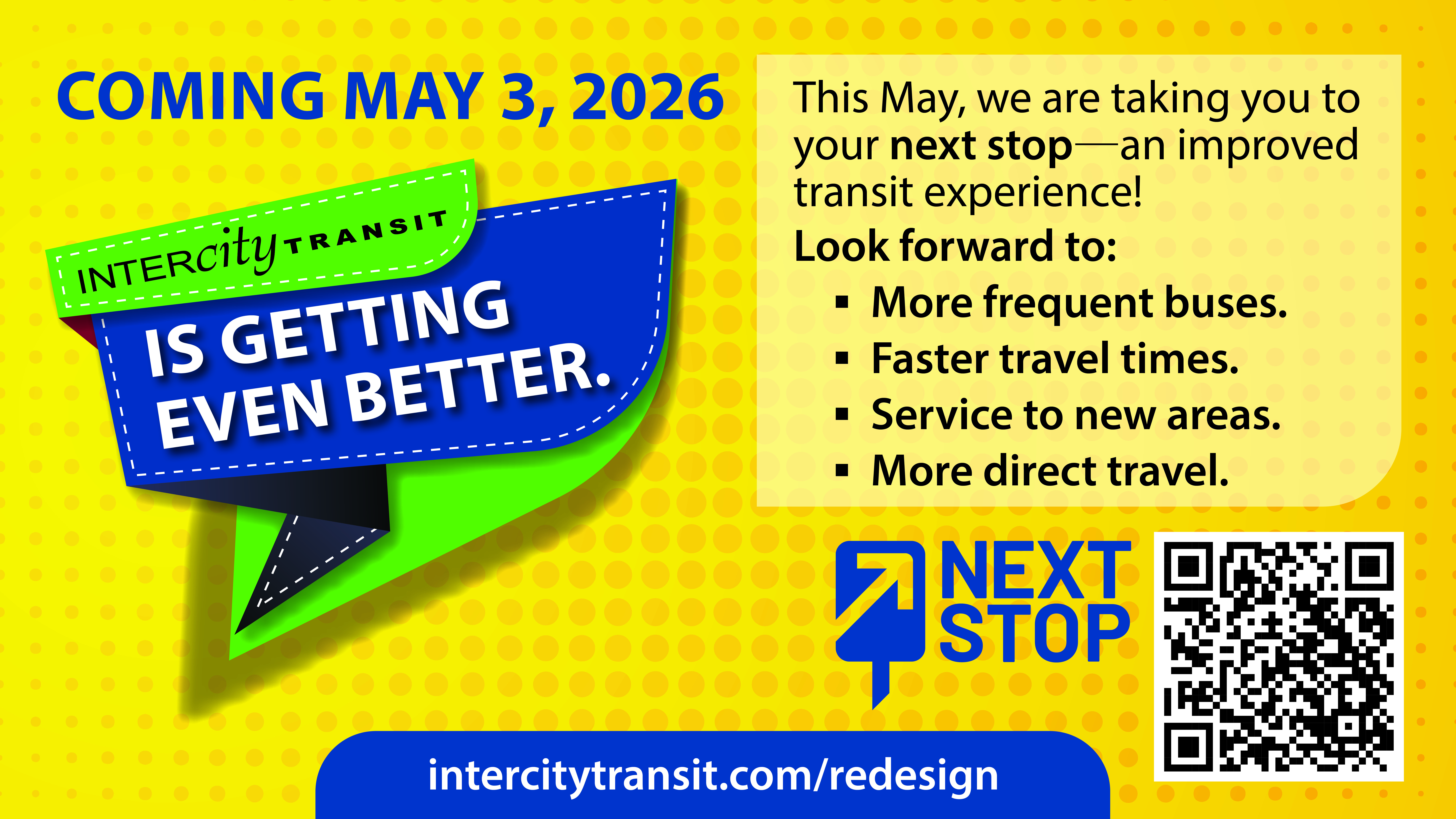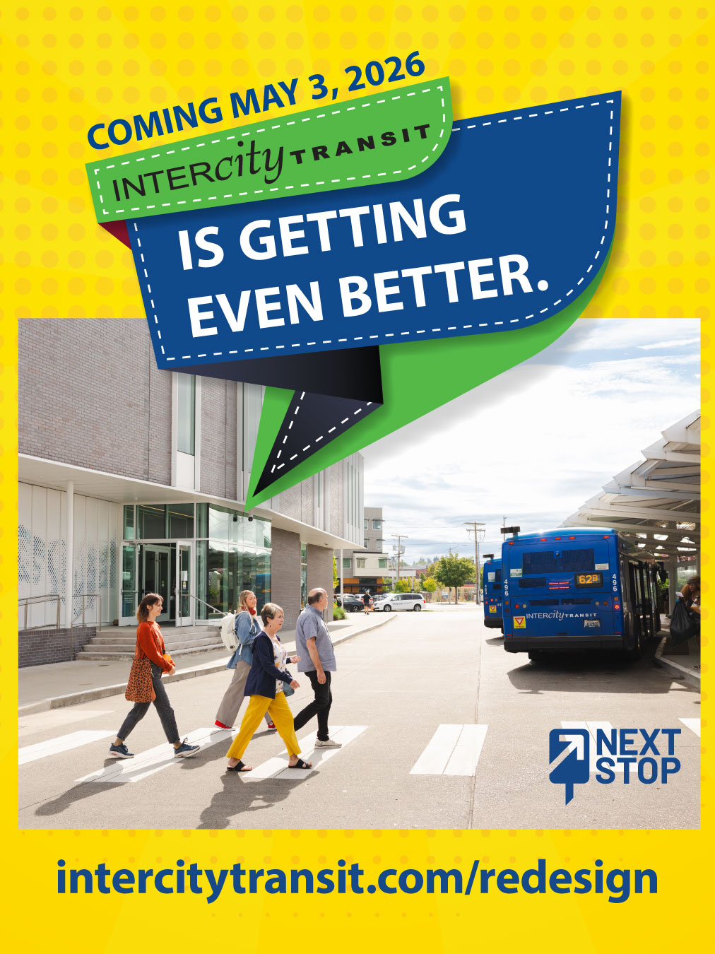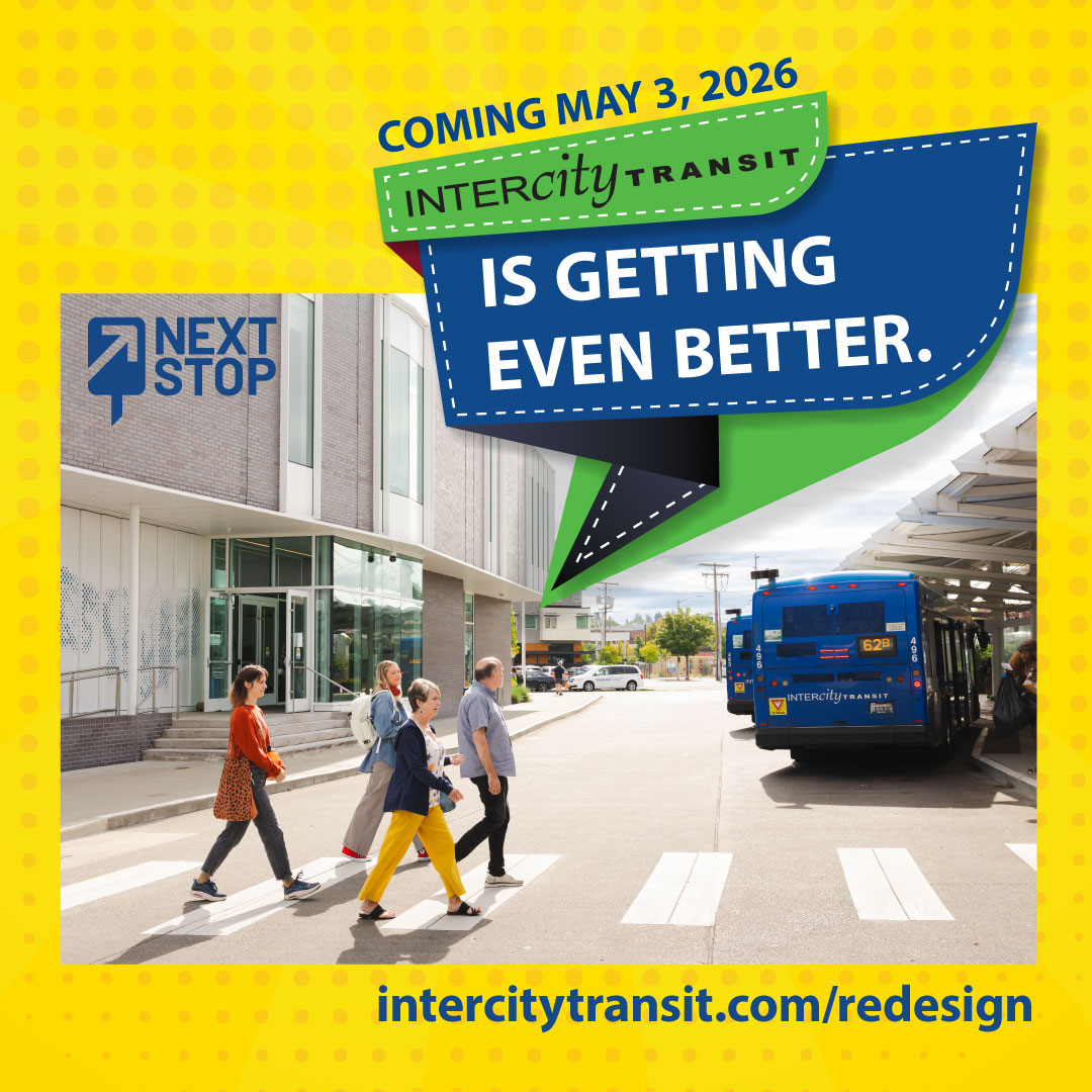 On May 3, 2026, the Intercity Transit service you know will take you to your next stop—an improved transit experience! Look forward to more frequent buses, faster travel times, service to new areas, and more direct travel. Check out intercitytransit.com/redesign for detailed information and helpful resources. More tools and information will be shared as they are finalized, including a trip planner, which will let you plan trips that take place after May 3. Check back often for updates online at intercitytransit.com and on their Facebook page, @IntercityTransit.