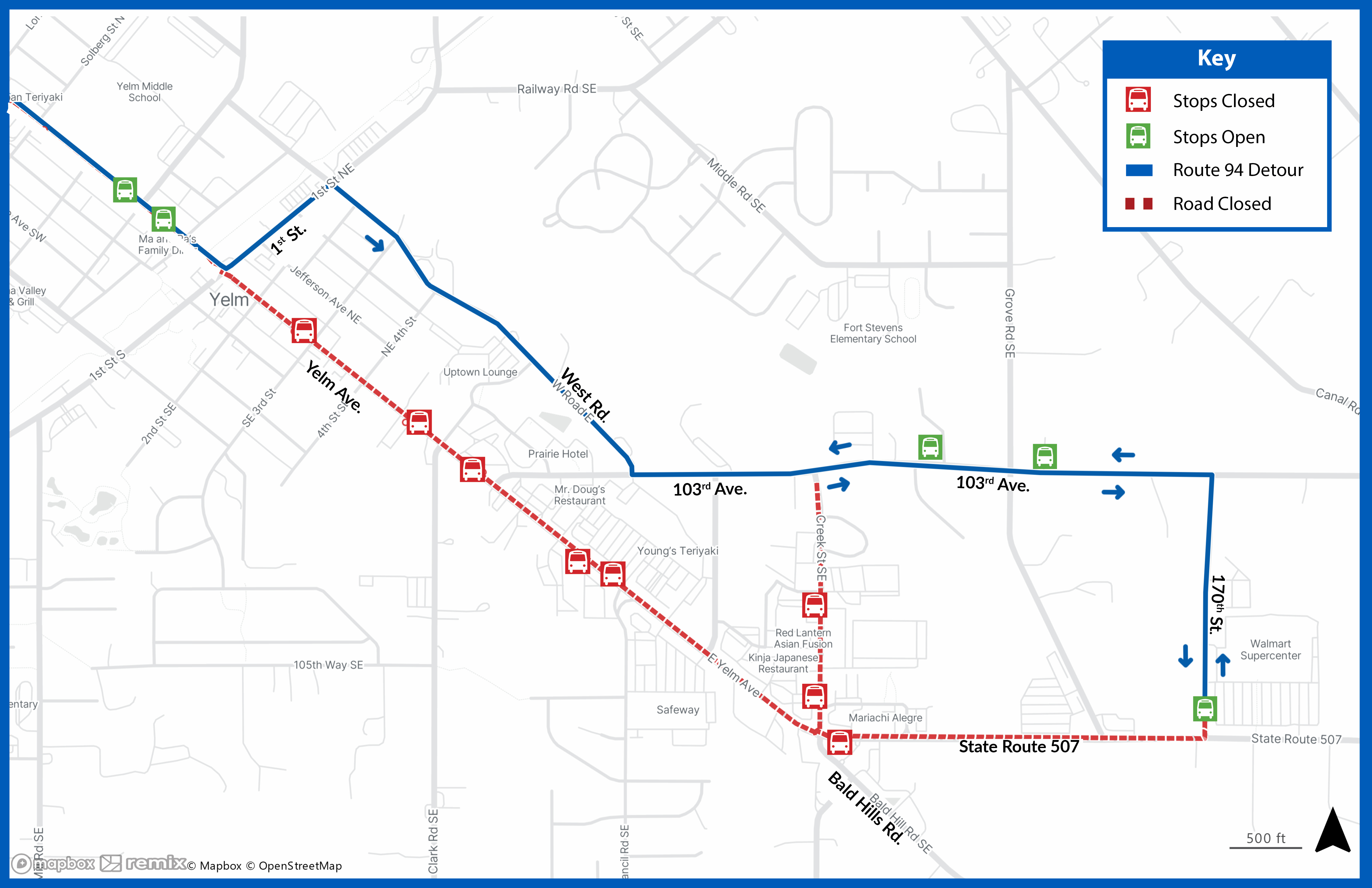 Due to the Yelm Christmas in the Park parade, Route 94 will be on detour in Yelm from 7 to 11 a.m. on Saturday, Dec. 6. Please use nearby stops. See the map below for details.