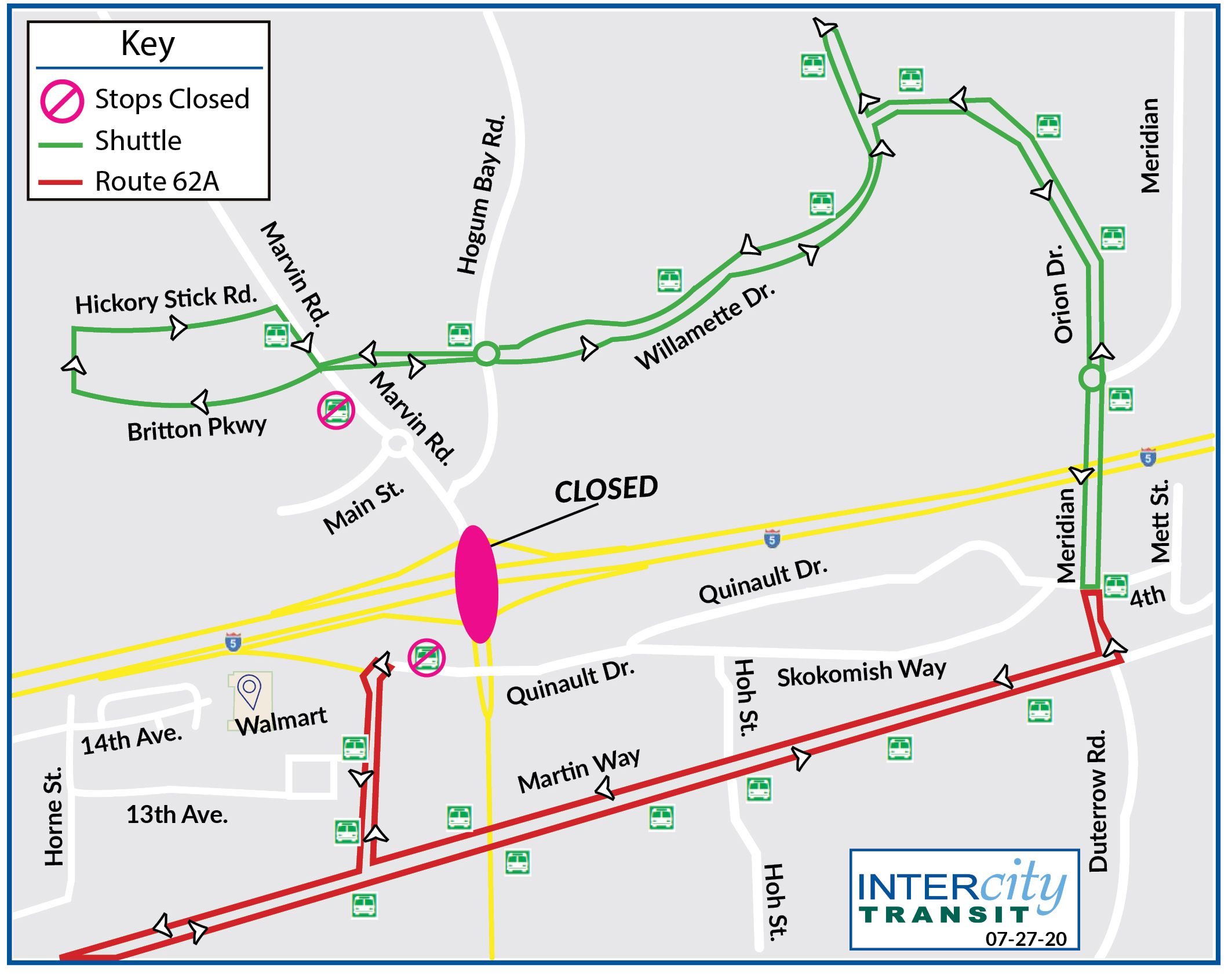 Route 62A will be on a modified route all day Saturday, Aug. 1 and Sunday, Aug. 2 due to the closure of the Marvin Rd. interchange. Route 62A will end at Meridian and 4th Ave.