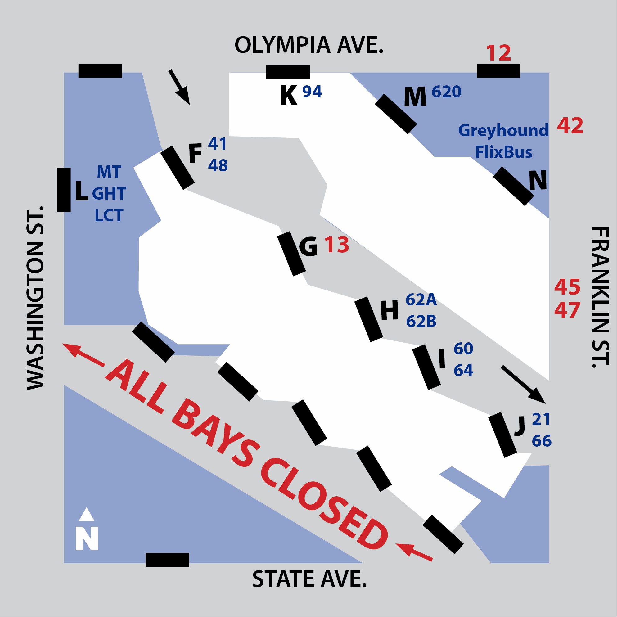 Due to construction at the Olympia Transit Center, all bays on the south platform will be closed starting Friday, Dec. 20. Work is anticipated to be completed on Tuesday, Dec. 24.