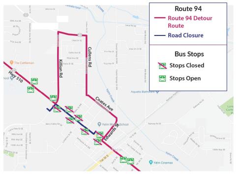 Route 94 will be on detour in Yelm Saturday, June 29 due to the Prairie Days Parade. Several stops along Highway 510 and Yelm Ave. will be closed from 9:30 a.m. - 12 p.m. Please catch the bus at Killion Rd. or 3rd Ave. while the detour is in place. For additional details please see the map below.