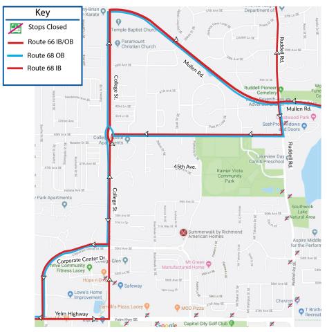 Routes 66 and 68 will be on detour from 7 a.m. to 3 p.m. on Tuesday, Sept. 3 due to the closure of the intersection at Yelm Highway and Ruddell Rd. for road construction. During the detour, there will be 16 total stops closed on Yelm Highway and Ruddell Rd. Please see the map below for details.